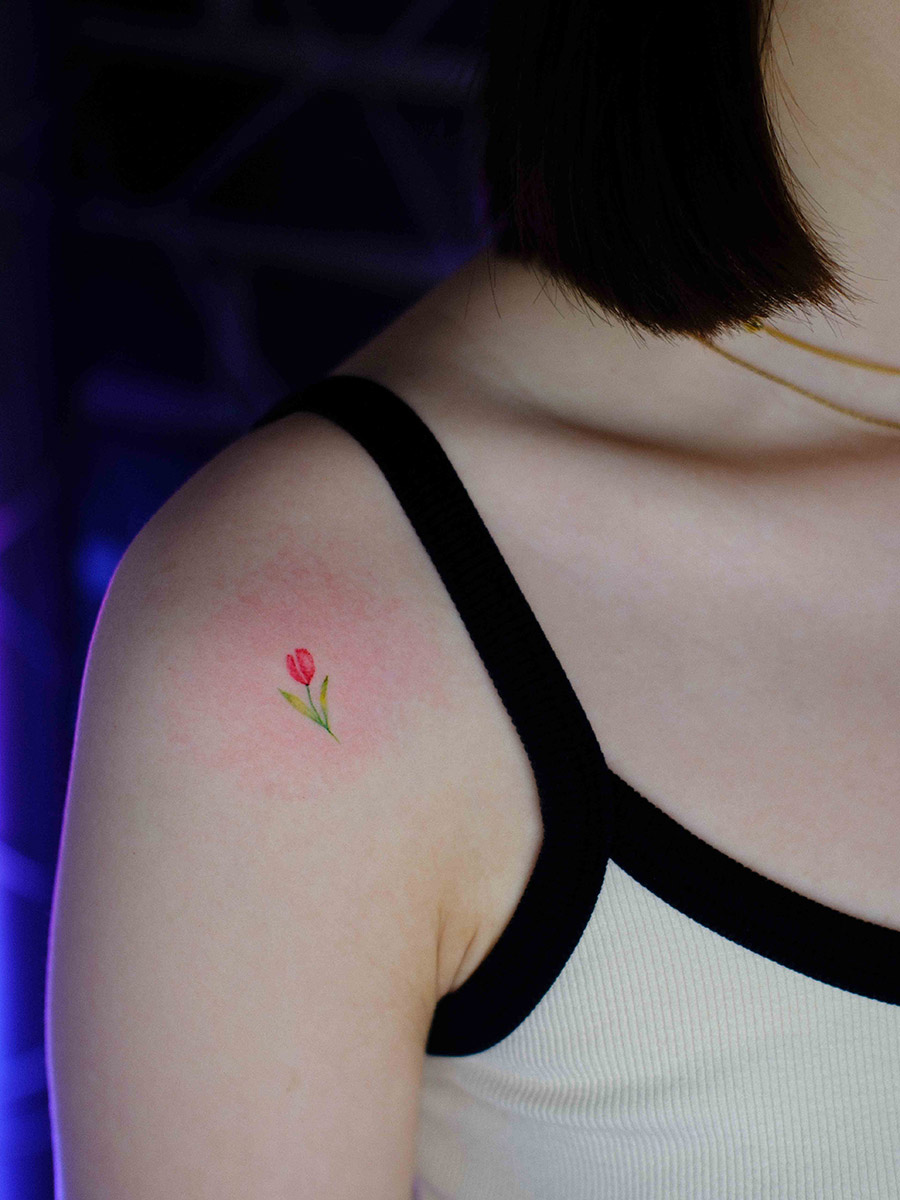 A solo traveler chose a mini tulip on her shoulder after reflecting on her journey.