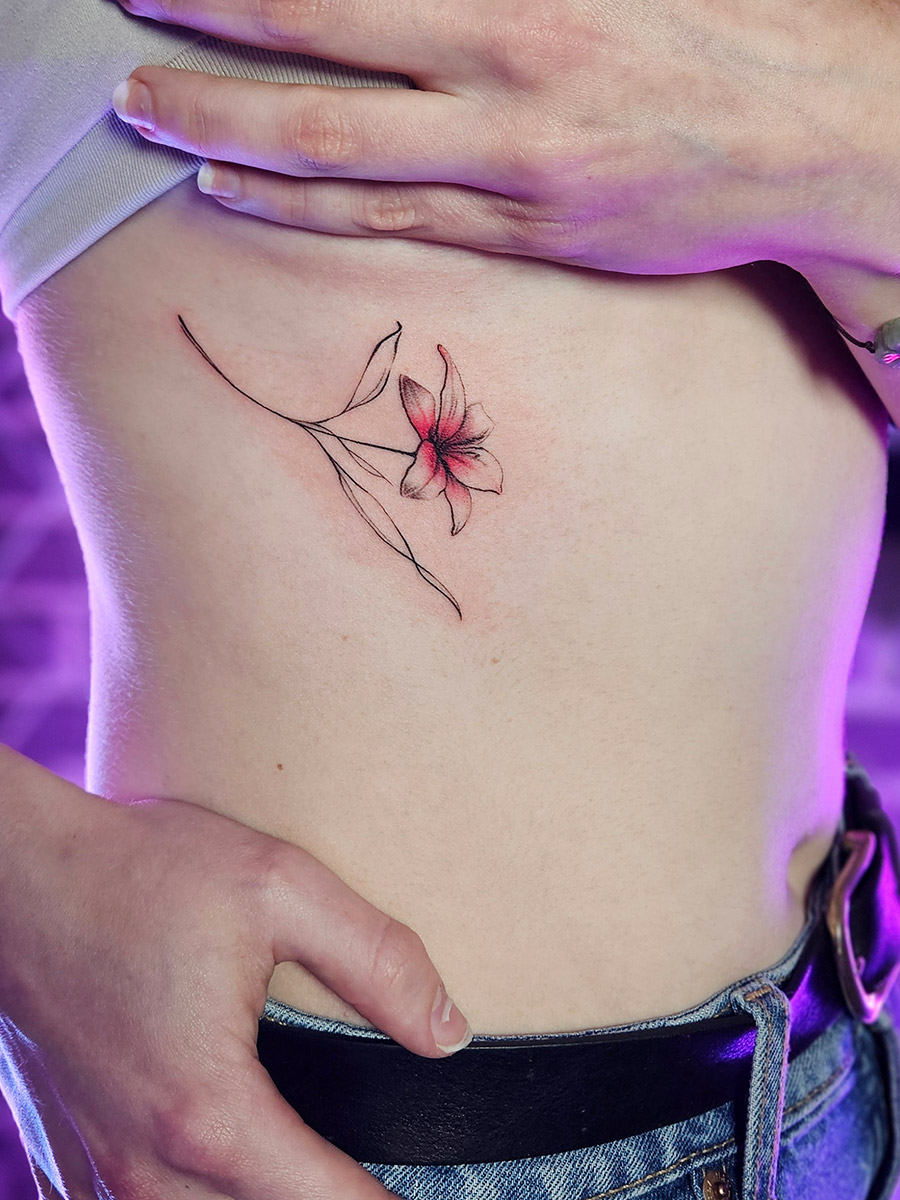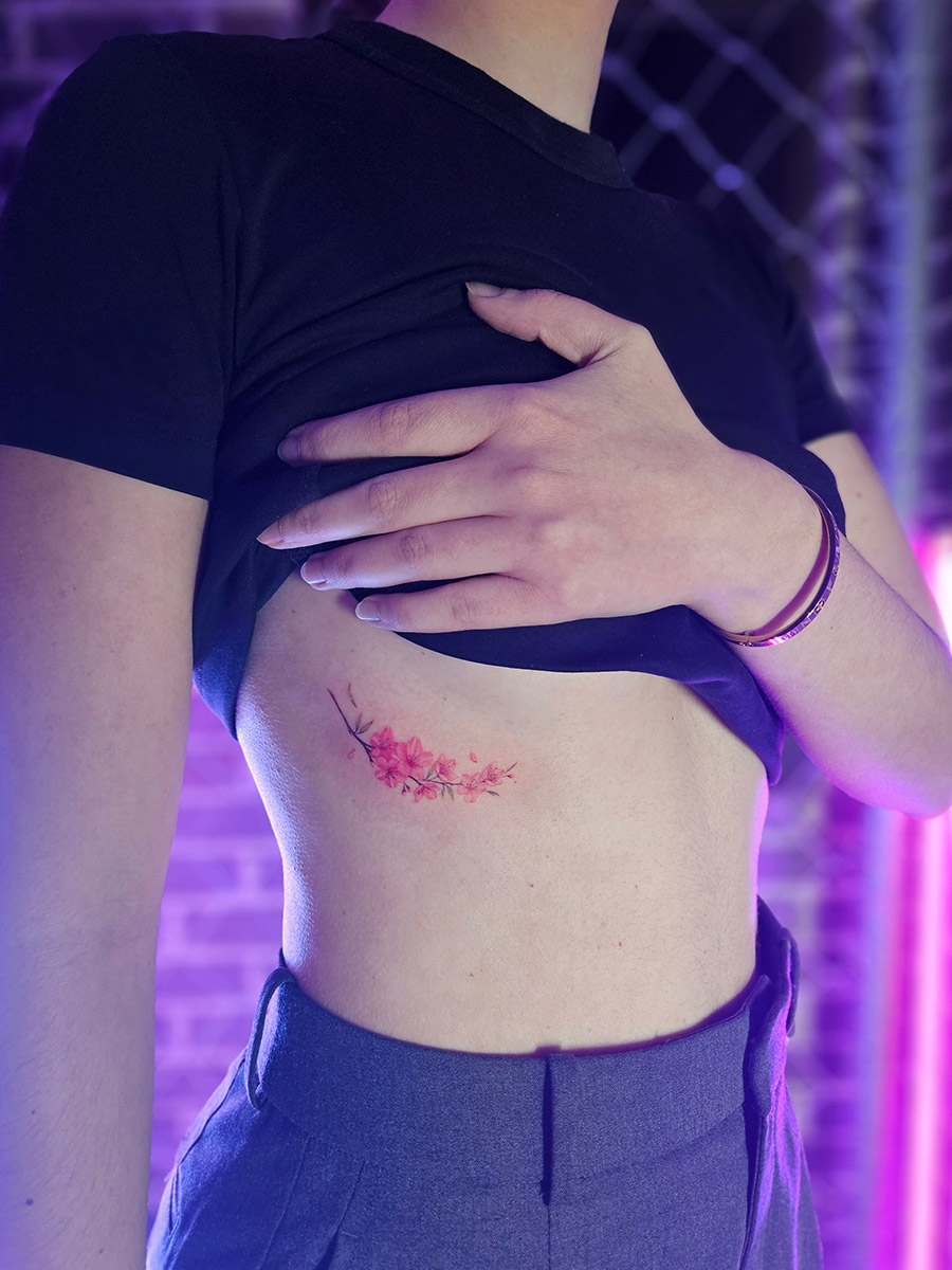 That simple moment stayed with her. So she chose a delicate pink floral tattoo on her ribs.